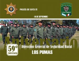 El Sr. Director General de Seguridad Rural «Los Pumas», Director de Policia Adrian L. Roland, con motivo de conmemorarse el 59 º Aniversario de la creación de esta prestigiosa Institución, hace llegar a los Señores Jefes y al personal que la componen un extenso y afectuoso saludo, siendo el momento propicio para agradecer por su eficiente y excelente labor en estos tiempos que nos toca atravesar.