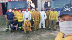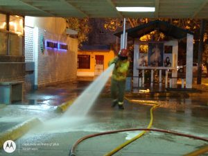 Como cada domingo, los Bomberos Voluntarios de nuestra ciudad realizaron el lavado y desinfección de veredas pertenecientes a aquellos comercios y organismos públicos, habilitados donde a diario se concentra la mayor circulación de los ciudadanos con el fin de incrementar la higiene en los espacios de tránsito común.