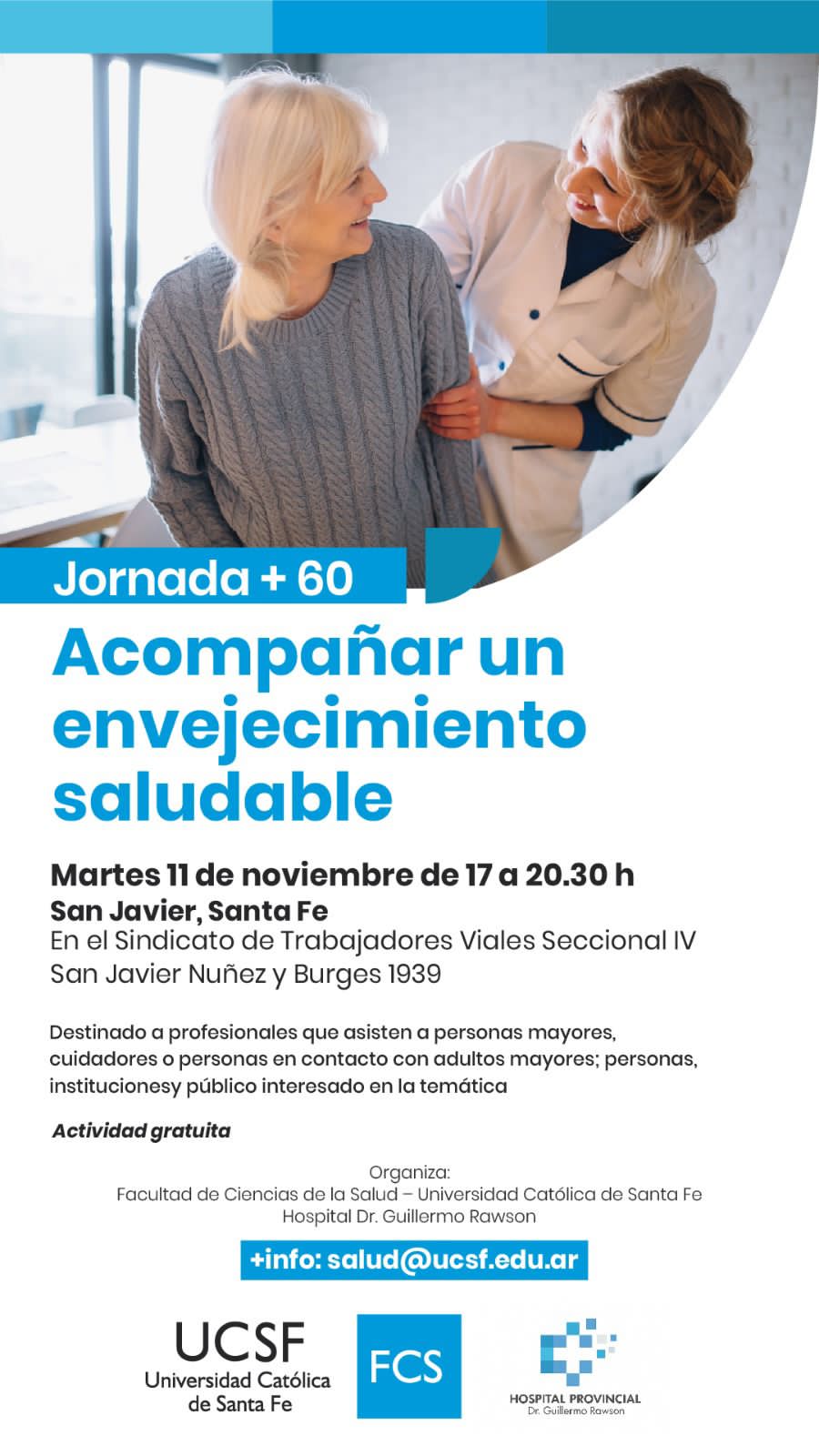 El Hospital “Dr. Guillermo Rawson” de San Javier, junto a la Facultad de Ciencias de la Salud de la Universidad Católica de Santa Fe (UCSF), invitan a participar de la Jornada “60+: Acompañar un envejecimiento saludable”, que se realizará el próximo martes 11 de noviembre de 2025, de 17:00 a 20:30 horas, en el Sindicato de Trabajadores Viales Seccional San Javier, ubicado en Núñez y Burges 1939.