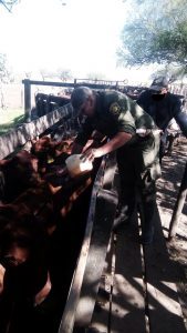 Personal Policial en horas de la tarde realizando tareas de prevención en zona rural de ésa jurisdicción, observaron que tres sujetos arribaron arreando hasta la Feria Sociedad Rural San Javier, un lote de hacienda bovina con el fin de luego ser vendida; por lo que a objeto de control, se verifico dichos semovientes en los corrales no surgiendo ninguna anomalía; no obstante siguiendo la pesquisa detectaron en depósito existente en la parte posterior del lugar, la cantidad de cuatro animales vacunos, categoría novillitos, los que formaban parte del lote antes referido, seguidamente constataron  y secuestraron los vacunos con posterior peritaje Médico Veterinario del cual dio como resultado: que los animales presentan estampado a fuego en anca y paleta números, y con lo obtenido de investigación lograron dar con quien sería el damnificado, dichos animales vacunos fueron entregados en forma definitiva a la víctima, siendo posteriormente reconocidos por el hermano del damnificado y capataz del Establecimiento de donde procedían los vacunos; todo con conocimiento e intervención del Sr. Fiscal en Turno: quien dispuso que en Estado de Libertad se impute a los tres sujetos del delito de ABIGEATO AGRAVADO EN GRADO DE TENTATIVA, siendo que los referidos poseen su hacienda en islas del Distrito San Javier, lindantes al damnificado. Interviene UFI- San Javier.