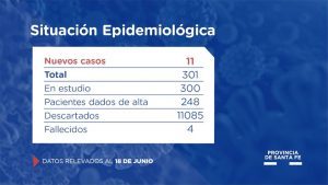 El Ministerio de Salud de Santa Fe, a través de la Dirección Provincial de Epidemiología, informa a la población que en el día de la fecha se han confirmado 11 casos nuevos de COVID-19, en el territorio provincial.