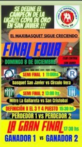 La jornada arrancará a las 11:00 horas con la primera semifinal entre Básquet San Javier y Círculo Vera. A las 13:00 hs. será el turno de la segunda semifinal, que enfrentará a Mitre La Gallareta contra San Cristóbal. La competencia continuará a las 15:30 hs. con la definición del 3º y 4º puesto, entre los perdedores de las semifinales.