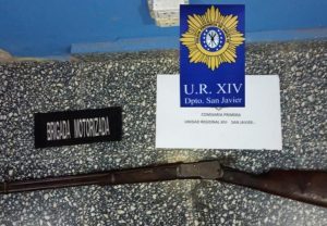 Posteriormente efectivos de la Unidad Regional XIV, constituidos en el lugar logran observar una embarcación tipo canoa de color azul de fibra de vidrio con motor de 13 hp modelo SH 390, con dos ocupantes a los que se los identifica siendo éstos dos masculinos mayores de edad, a los que se les secuestra un arma de fuego.