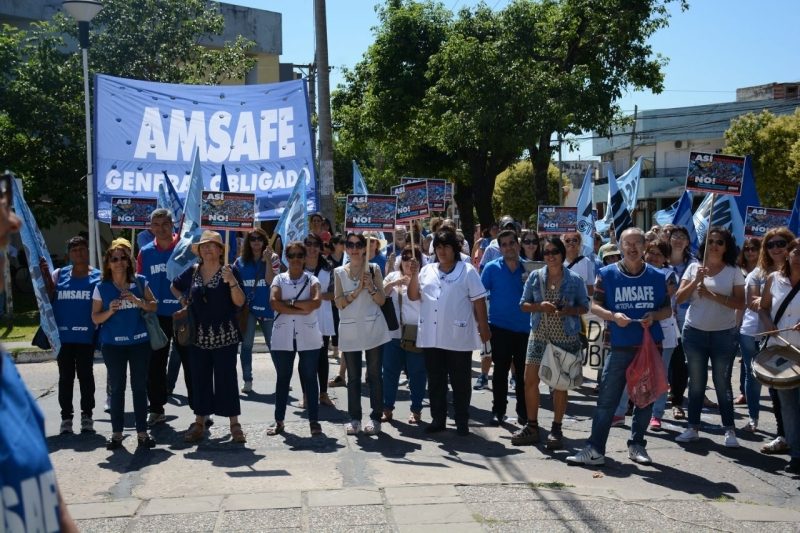 En el acto desarrollado en Santa Fe ante un millar de docentes provenientes de toda la provincia, intervinieron Oscar Loseco –Sec. General de AMSAFE La Capital-, Patricia Mounier –Sec. General de SADOP Santa Fe- y Sonia Alesso –Sec. General de AMSAFE Provincial-, quienes expresaron el malestar generado en la docencia santafesina por la decisión arbitraria del gobierno de la provincia de otorgar una suma fija sin mediar discusión alguna con los gremios docentes.