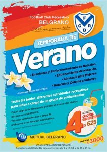Recordemos que los interesados deben pasar por la Secretaría del Club y consultar por más detalles como así también por las diferentes financiaciones que pueden realizar a través de Mutual Belgrano. Durante la temporada se desarrollan diferentes actividades para toda la familia como natación (aprendizaje, perfeccionamiento y entrenamiento, Gimnasia para Damas y Colonia para Adultos)¸también se podrán disponer de instalaciones que han sido remodeladas especialmente para disfrutar del natatorio, espacios verdes recreativos y deportivos.