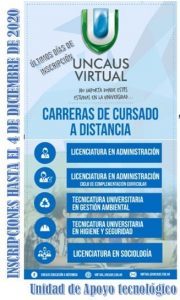 La Unidad de Apoyo tecnológico de Punto Digital de la Municipalidad de San Javier informa que el día 4 de diciembre de 2020 culminarán las inscripciones de UNCAUS (Universidad Nacional de Chaco Austral), para todas las carreras a distancia propuestas por la mencionada casa de estudios.
