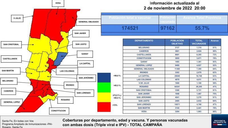 La Campaña Nacional de Vacunación contra Sarampión, Rubéola, Paperas y Poliomielitis, que comenzó el 1 de octubre y termina el 13 de noviembre, alcanzó a un 75% de la población destinataria, en el departamento San Javier. Sin embargo, su aplicación se encuentra pendiente para el 25 % restante, a fin de alcanzar el total de la población objetivo del plan de seguimiento nacional, obligatorio y gratuito.